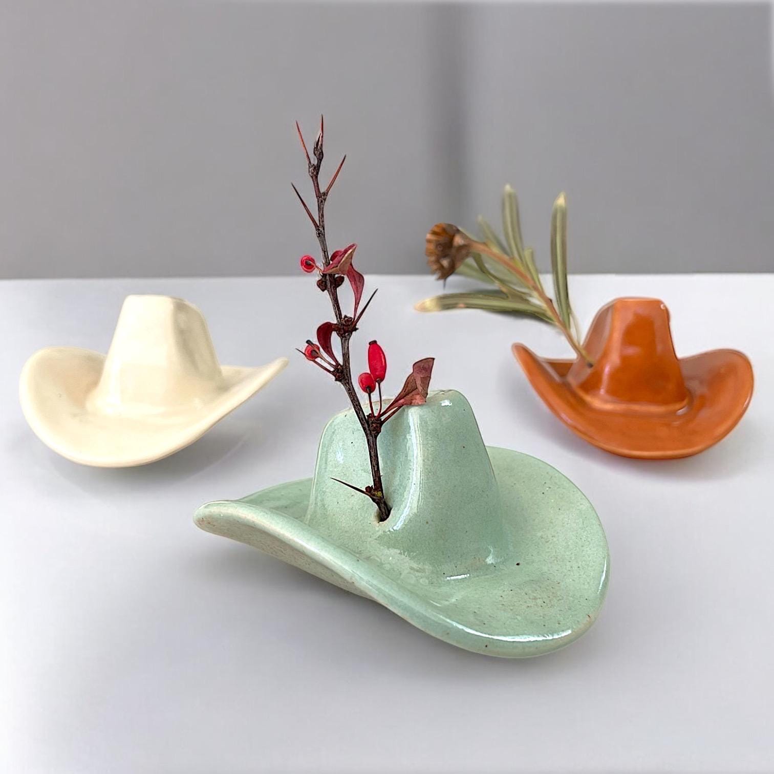 This small ceramic cowboy hat is a playful and versatile piece perfect for adding a touch of western charm to any space. Handcrafted from durable stoneware, it features a rich crackle parchement clear glaze that highlights its rustic character. The hat’s crown includes a thoughtfully placed hole, making it ideal as a unique weed vase, an incense stick holder, or a delightful decorative accent on its own. Whether displayed on a shelf, desk, or table, this handmade cowboy hat is a creative nod to western style and a fun conversation starter for your home or office.